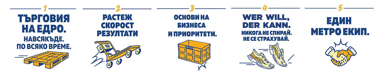 Ние в МЕТРО си поставихме високи цели с нашата стратегия за растеж sCore. Основите на успеха са нашия пътеводител в МЕТРО. Те определят нашите споделени ценности и ни предоставят ясни и последователни правила за поведение. Те са задължителни за всички в МЕТРО, във всички държави и компании. И те започват с ангажимент: ние сме на търговец на едро. Търговията на едро е това, което правим най-добре. И искаме да станем още по-добри. Основата за това е нашият дух на ЕДИН МЕТРО ЕКИП: всеки е нужен, всички сме заедно – с любопитство и решителност, смелост и стремеж, ангажираност и доверие.
